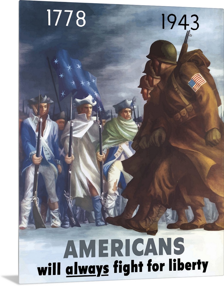 <p>This vintage war poster features American Infantryman marching past Minutemen from the Revolutionary War. The top features the dates 1778 and 1943, and the bottom declares - Americans Will Always Fight For Liberty.</p>