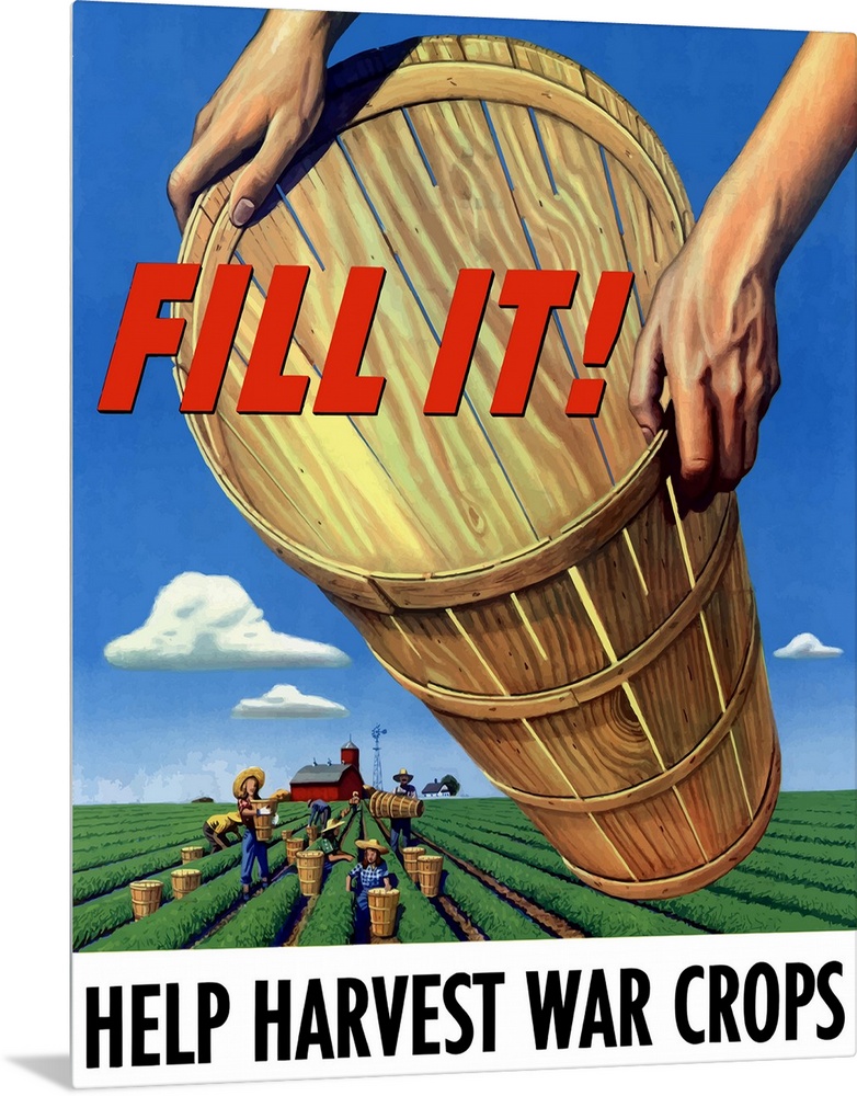 <p>Digitally restored vector war propaganda poster. This vintage World War Two product features workers harvesting crops in a field and out stretched hands holding an empty basket. It declares - Fill It! Help Harvest War Crops.</p>