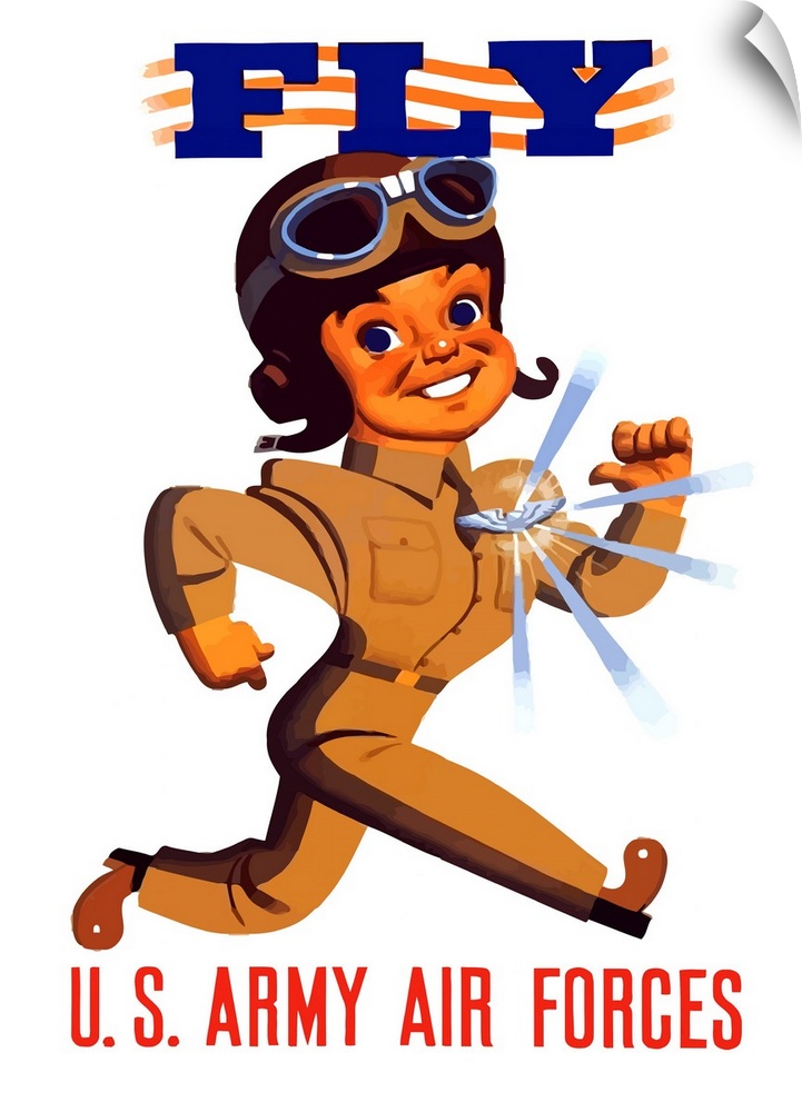 <p>Digitally restored vector war propaganda poster. This vintage World War Two poster features a cartoon aviator, his pilots wings glowing. It declares - FLY, U.S. Army Air Forces.</p>