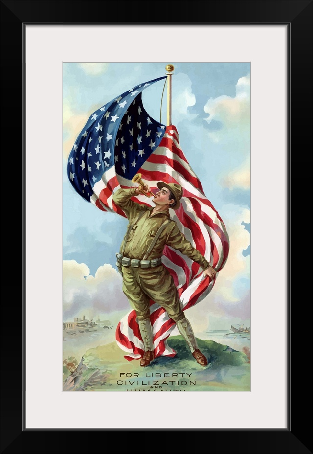 <p>Digitally restored vector war propaganda poster. This vintage World War One poster features a U.S. soldier blowing a bugle in front of a waving American Flag. It declares - For Liberty, Civilization, and Humanity.</p>
