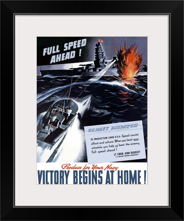 <p>Digitally restored vector war propaganda poster. This vintage World War Two poster features American PT boats attacking a Japanese warship at night. It declares - Full Speed Ahead, Produce For Your Navy, Victory Begins At Home!</p>