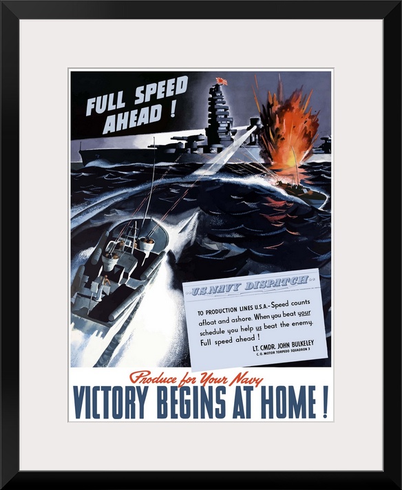 <p>Digitally restored vector war propaganda poster. This vintage World War Two poster features American PT boats attacking a Japanese warship at night. It declares - Full Speed Ahead, Produce For Your Navy, Victory Begins At Home!</p>