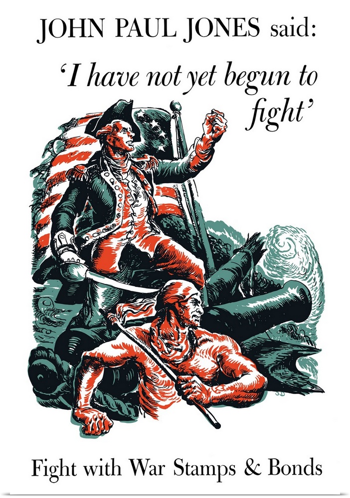 <p>Digitally restored vector war propaganda poster. This vintage World War II poster features John Paul Jones commanding men in front of The American Flag. It declares - John Paul Jones said: I have not yet begun to fight. Fight with war stamps and bonds.</p>