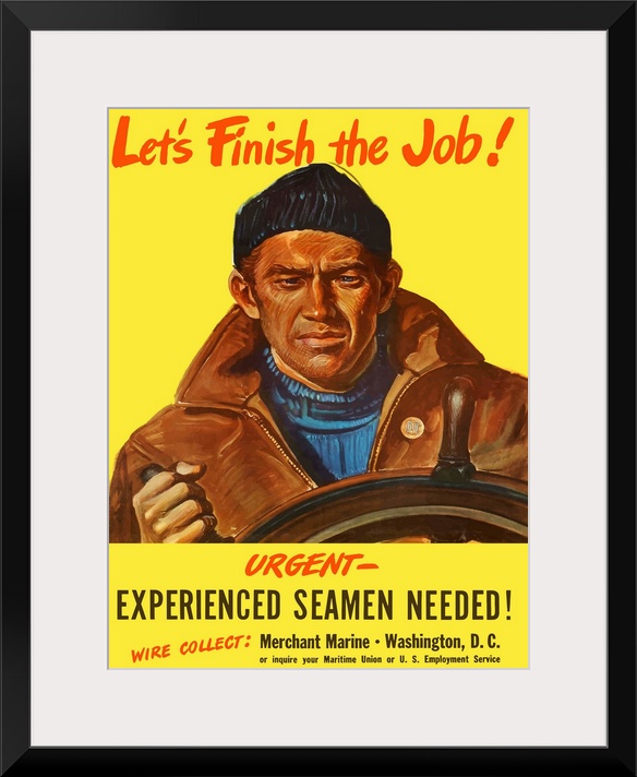<p>Digitally restored vector war propaganda poster. This vintage World War Two poster features a sailor at the helm of a ship. It declares - Let's finish the job! Urgent, Experienced Seamen Needed!</p>