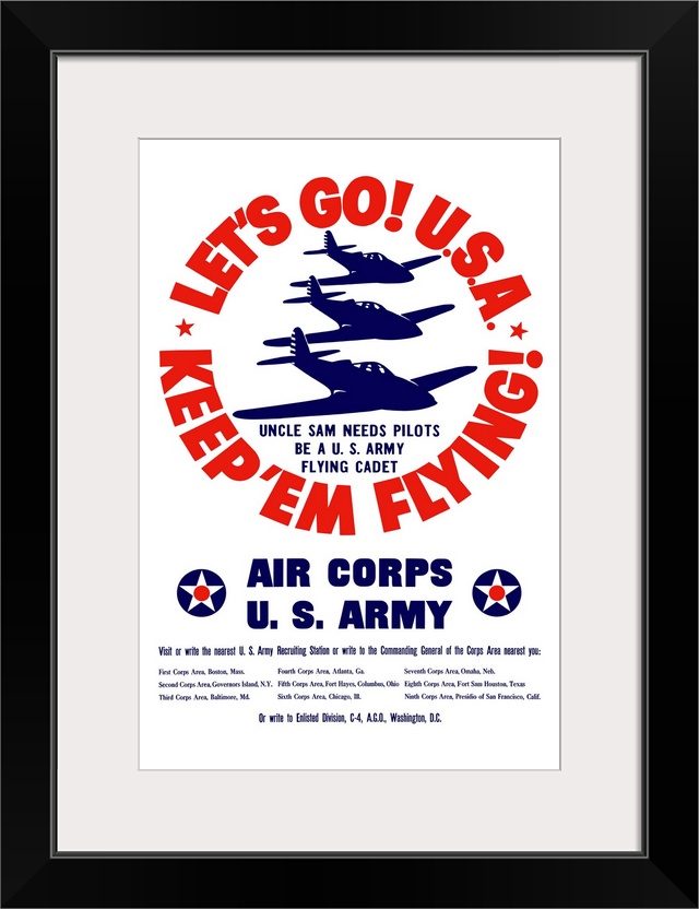 <p>Digitally restored vector war propaganda poster. This vintage World War II poster features three fighter planes and a red, white, and blue theme. It declares - Let's Go U.S.A. Keep 'Em Flying! Uncle Sam Needs Pilots. Air Corps U.S. Army.</p>