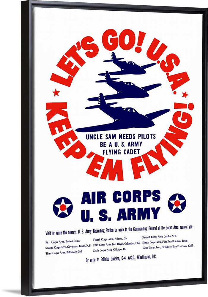 <p>Digitally restored vector war propaganda poster. This vintage World War II poster features three fighter planes and a red, white, and blue theme. It declares - Let's Go U.S.A. Keep 'Em Flying! Uncle Sam Needs Pilots. Air Corps U.S. Army.</p>