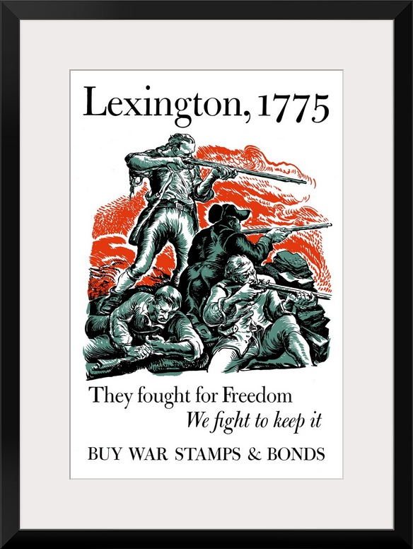 <p>Digitally restored vector war propaganda poster. This vintage World War II poster features American Minutemen firing their rifles in battle. It declares - Lexington, 1775, They Fought For Freedom, We Fight To Keep It. Buy War Stamps</p>