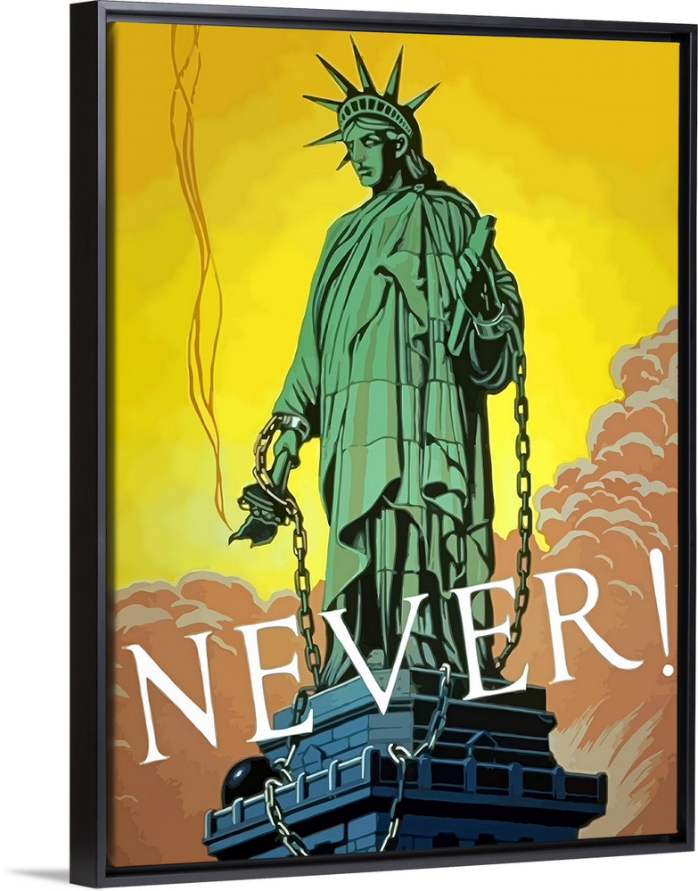 <p>Digitally restored vector war propaganda poster. This vintage World War Two poster features the Statue of Liberty with her torch extinguished and her hands chained and handcuffed. It declares - Never!</p>