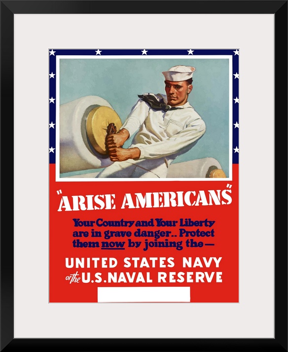 <p>Digitally restored vector war propaganda poster. This vintage World War Two poster features a United States Sailor arming a cannon. It declares - Arise Americans, Your Country and Your Liberty are in grave danger... Protect them now by joining the United States Navy or the U.S. Naval Reserve.</p>