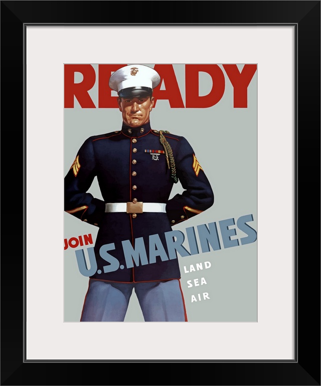 <p>Digitally restored vector war propaganda poster. This Marine Corps recruiting poster from World War II features a sergeant wearing his dress blues. It declares - Ready, Join U.S. Marines, Land Sea Air.</p>