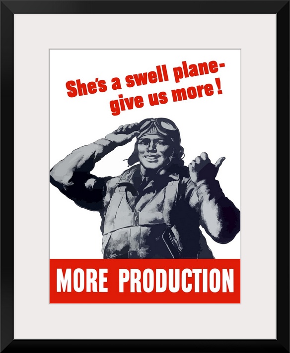 <p>Digitally restored vector war propaganda poster. This vintage World War II poster features a smiling pilot wearing his flight suit. It declares - She's a swell plane, give us more! More Production.</p>