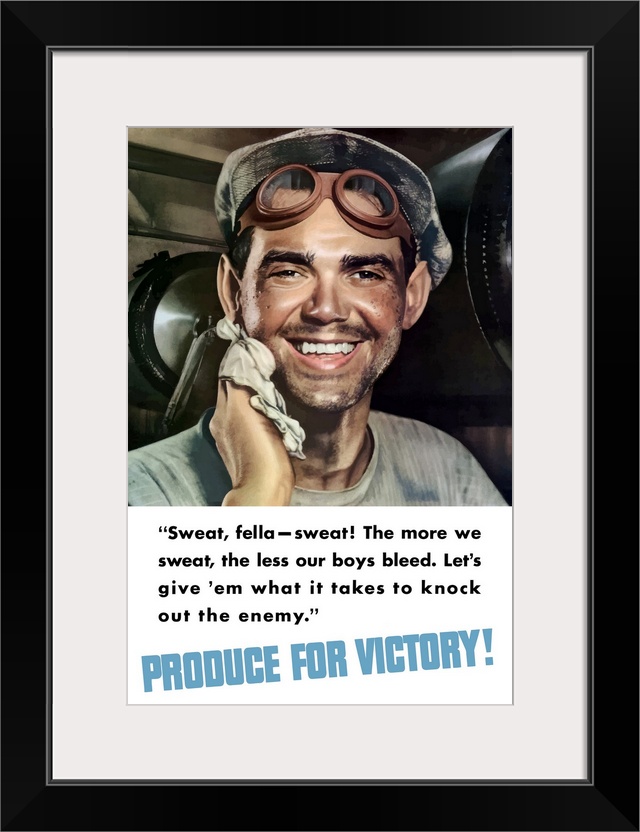 <p>Digitally restored vector war propaganda poster. This vintage World War II poster features a sweating factory worker toweling off his face. It declares - Sweat, fella, sweat! The more we sweat, the less our boys bleed. Let's give 'em what it takes to knock out the enemy. Produce For Victory!</p>