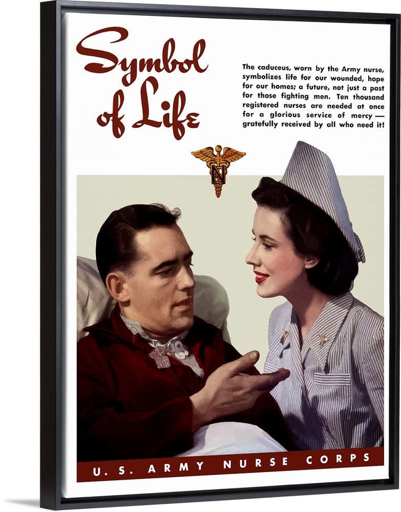 <p>Digitally restored vector war propaganda poster. This vintage World War II poster features an army nurse, a veteran in a hospital bed, and a caduceus. It declares - Symbol of Life, The caduceus, worn by the Army nurse, symbolizes life for our wounded, hope for our homes; a future, not just a past for those fighting men. Ten thousand registered nurses are needed at once for a glorious service of the mercy, gratefully received by all who need it. U.S. Army Nurse Corps.</p>