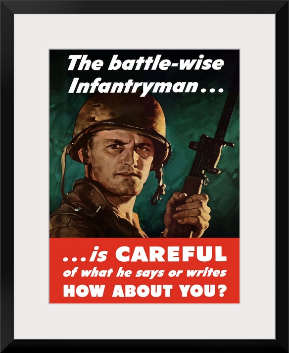 <p>Digitally restored vector war propaganda poster. This vintage World War Two poster features a stern American G.I. holding his rifle. It declares - The Battle-Wise Infantryman Is Careful Of What He Says Or Writes, How About You?</p>