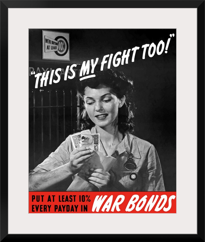 <p>Digitally restored vector war propaganda poster. This vintage World War II poster features a female factory worker holding her earning after payday. It declares - This is my fight too! Put at least 10 every payday in War Bonds.</p>