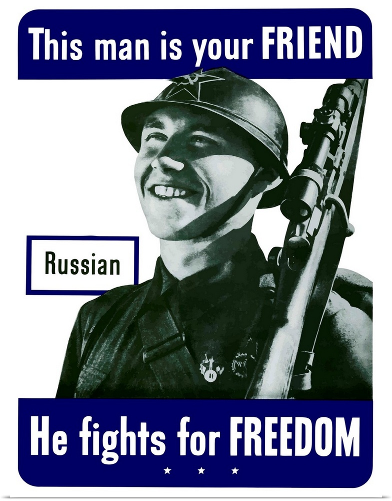<p>Digitally restored vector war propaganda poster. This vintage World War Two poster features a smiling Russian soldier. It declares - This man is your friend, He fights for freedom.</p>