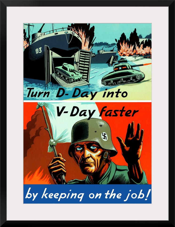 <p>Digitally restored vector war propaganda poster. This vintage World War Two poster features a ship unloading tanks onto a beach and a German soldier waving a white flag. It declares - Turn D-Day into V-Day faster by keeping on the job.</p>