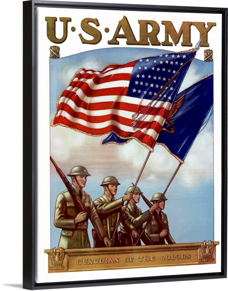 <p>Retro poster for the US Army on canvas with soldiers carrying flags and guns while marching.</p>