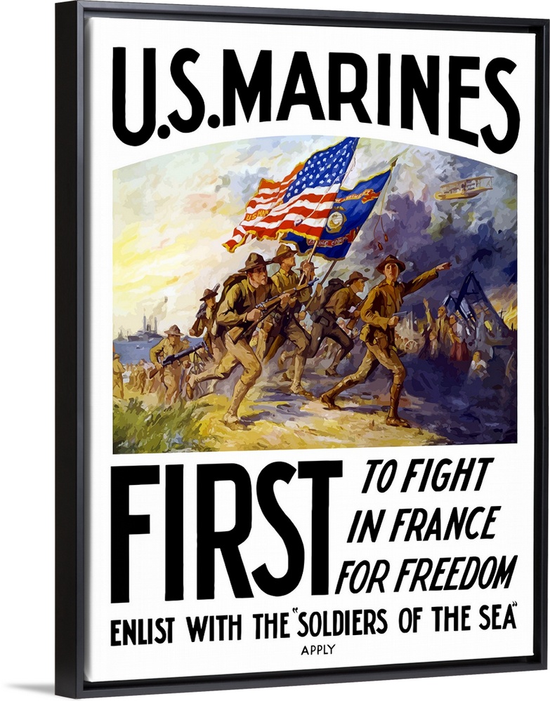 <p>This historical propaganda poster shows marines rushing over a hill in to a battle field carrying decorative flags.</p>