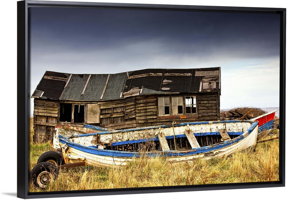 <p>Dilapidated boathouse and boat, Beadnell, Northumberland, England</p>