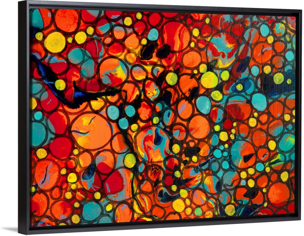 <p>A contemporary abstract painting of a saturated clustering of what resembles air bubbles with vibrant colors beneath.</p>