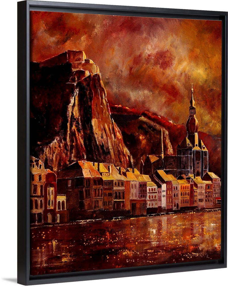 <p>A solemn painting of the city of Dinant in Belgium in warm colors of red.</p>