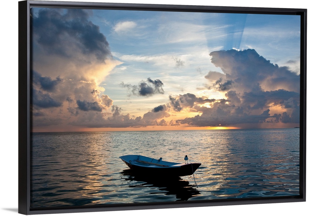 <p>Dinghy boat in sea at sunset, Great Exuma Island, Bahamas</p>