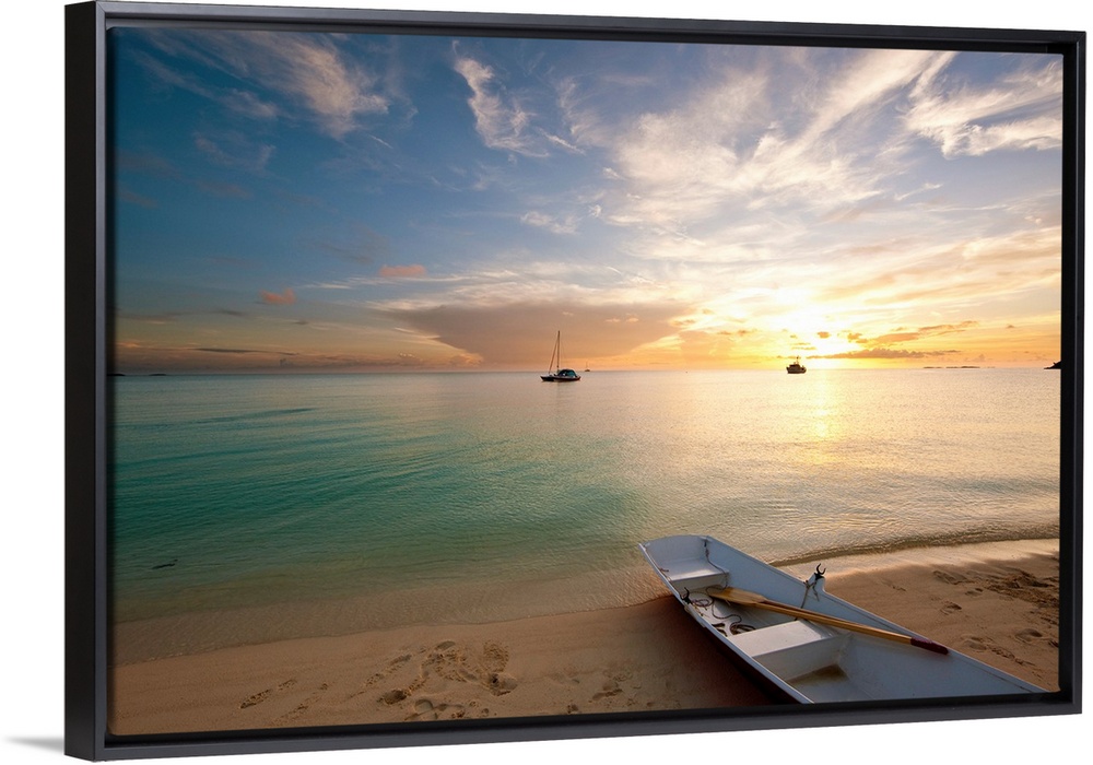 <p>Dinghy boat on beach at sunset, Great Exuma Island, Bahamas</p>