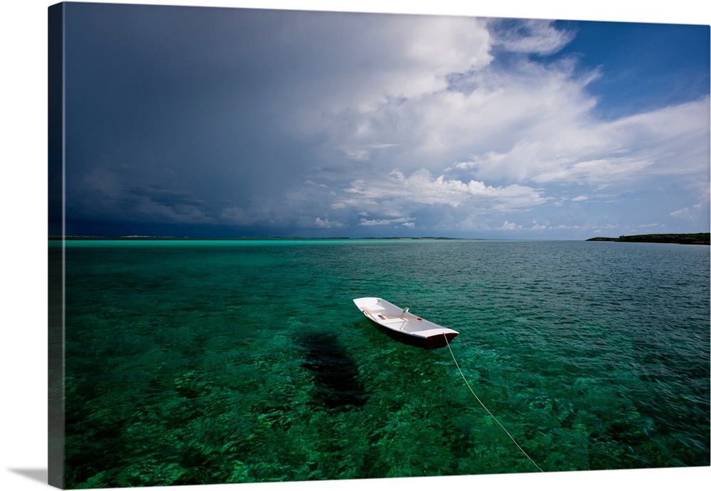 <p>Dinghy in clear turquoise water, Great Exuma Island, Bahamas</p>