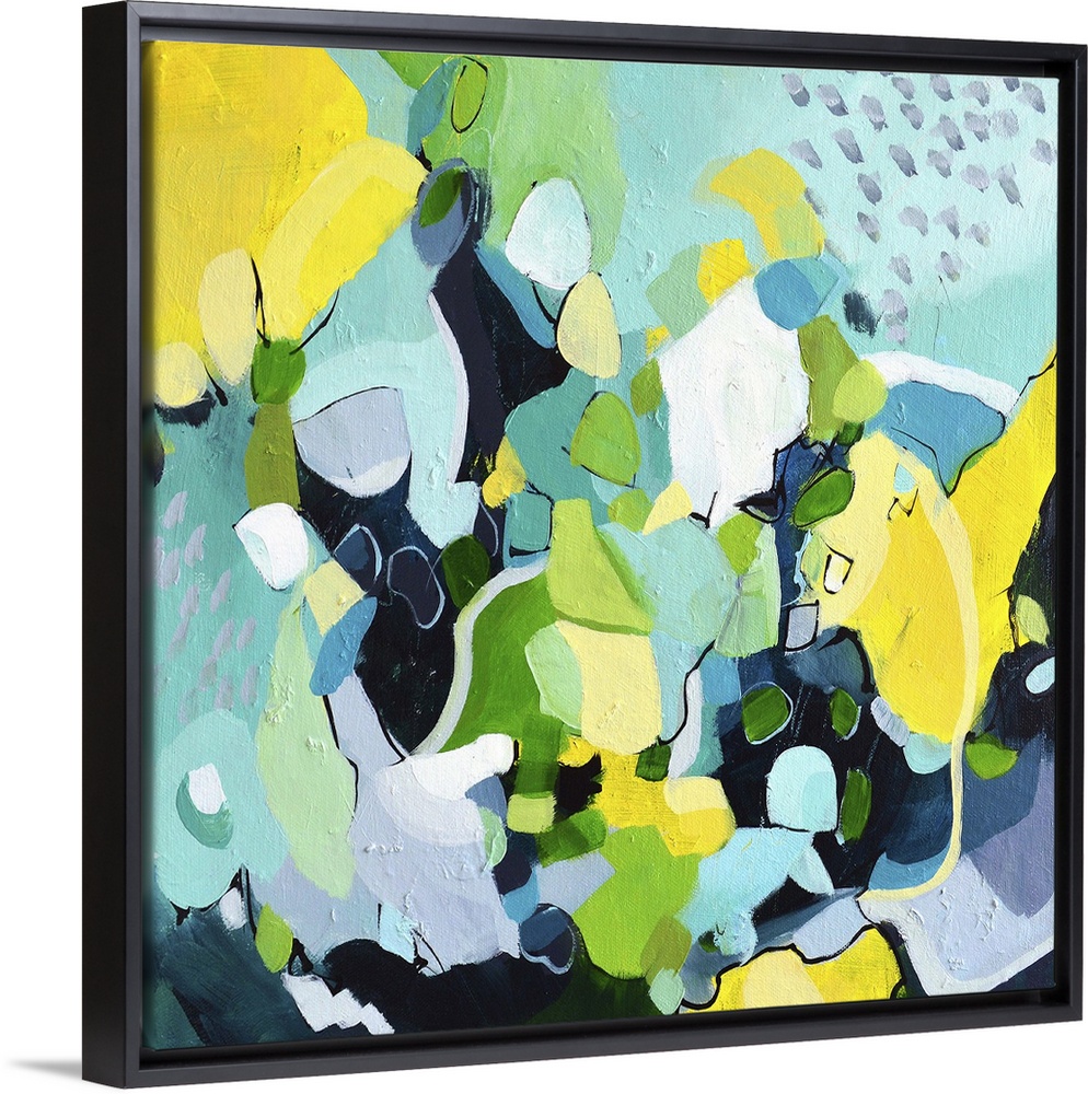<p>Festive abstract painting with blue, green, and yellow shapes.</p>