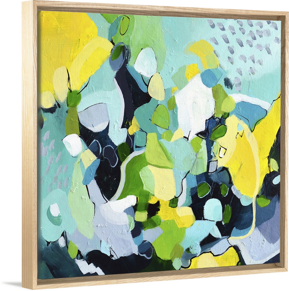 <p>Festive abstract painting with blue, green, and yellow shapes.</p>