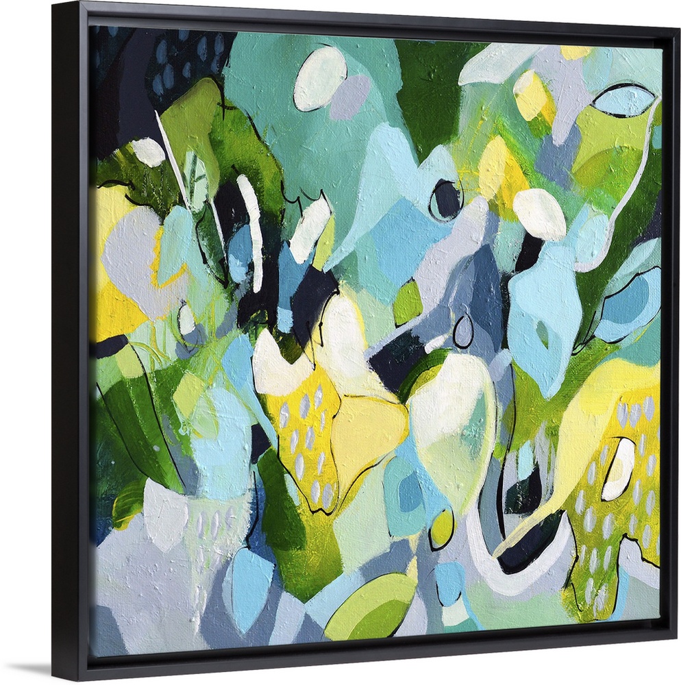 <p>Festive abstract painting with blue, green, and yellow shapes.</p>