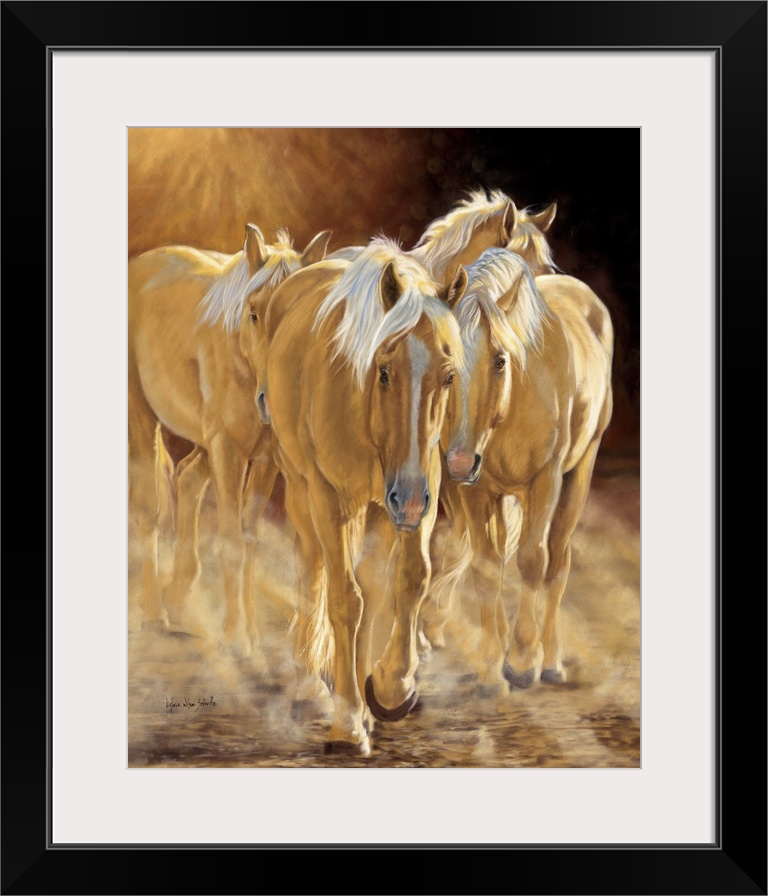 <p>A herd of palomino horses walking in the late afternoon light.</p>