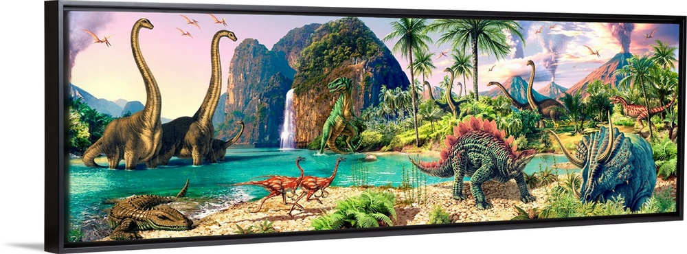 <p>Panoramic, large artwork of a prehistoric landscape with volcanoes and a waterfall in the background, and numerous types of dinosaurs throughout, including the tyrannosaurus rex, brontosaurus, triceratops, and the stegosaurus.</p>