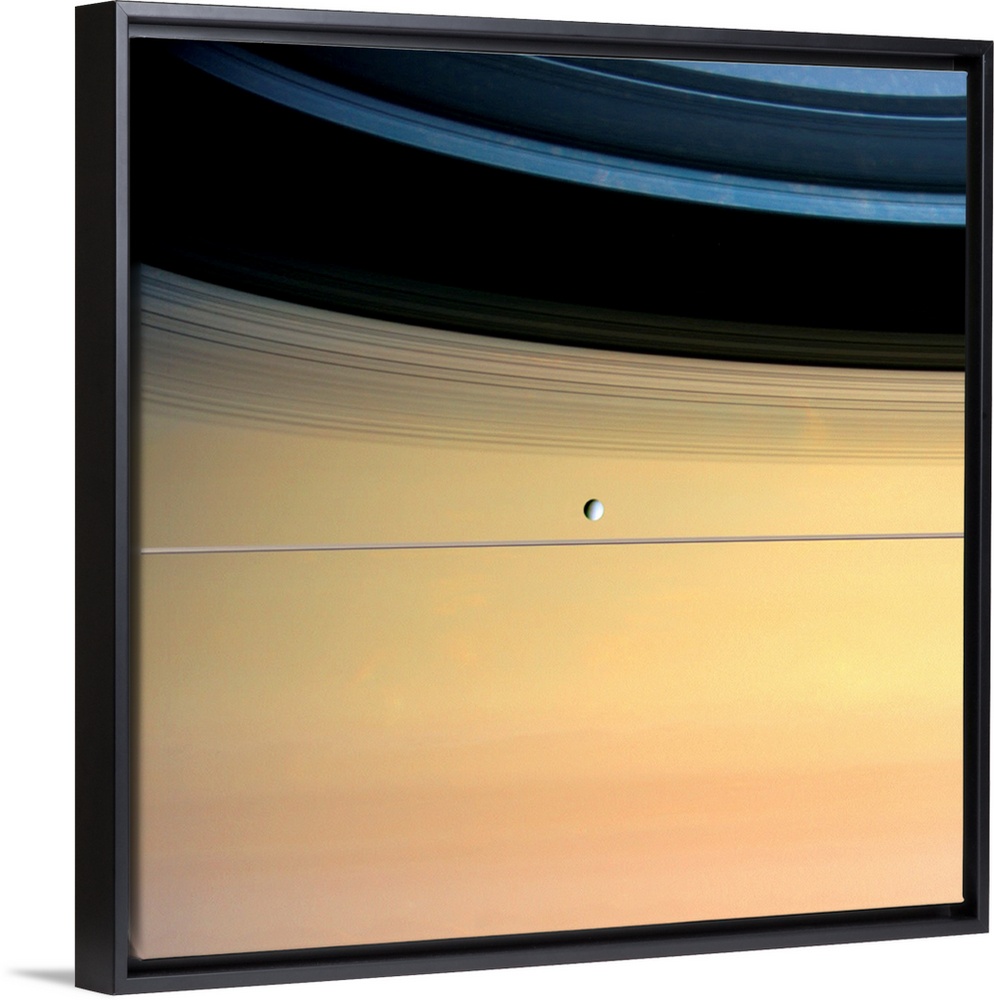 <p>Dione and ring shadows on Saturn, Cassini image. Dione is around 1123 kilometres in diameter and orbits some 377,000 kilometres from the giant Saturn. Saturn's rings are edge-on in this view, and run across centre just below Dione. Due to the high inclination of Saturn to the Sun at this time, the shadows of the rings are widely spread across its clouds in upper frame. The varying densities of the rings are responsible for the varying darkness of the shadows. This image was taken on 22nd September 2005, when Cassini was around 803,000 kilometres from Dione. Courtesy of NASA / JPL / SPACE SCIENCE INSTITUTE.</p>