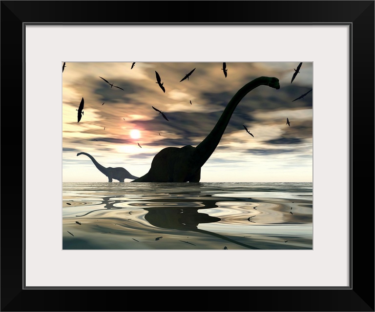 <p>Giant sauropod Diplodocus dinosaurs relax at the end of a long hot day by bathing in the nearest body of water.</p>