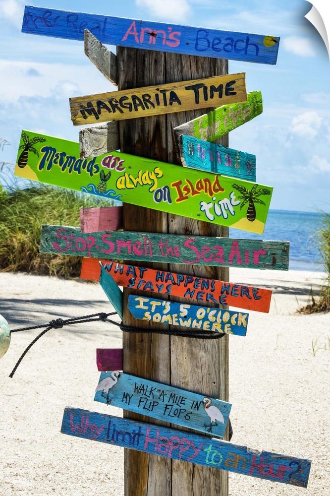 <p>A collection of colorful humorous signs on a wooden post on the beach.</p>