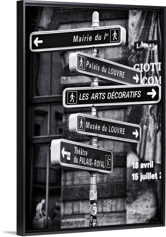 <p>Black and white photograph of a signpost with several signs pointing towards different places of interest in Paris.</p>