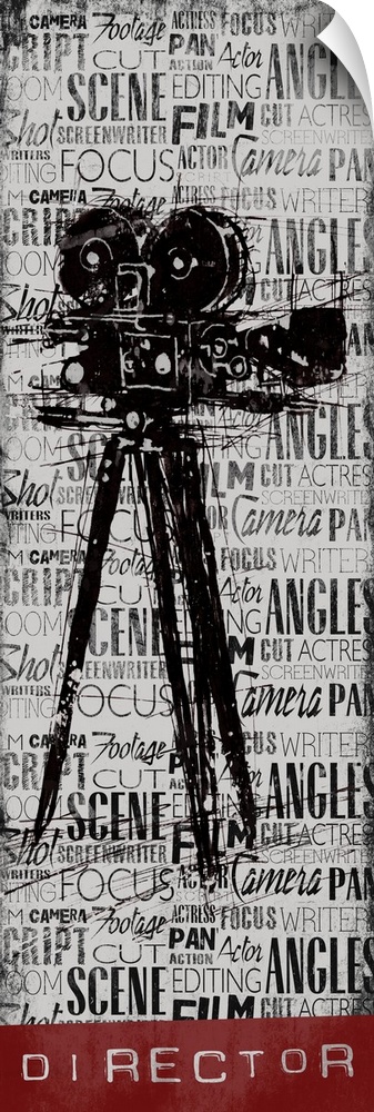 <p>A vintage camera on a background filled with layers of text, with the word "Director" at the bottom.</p>