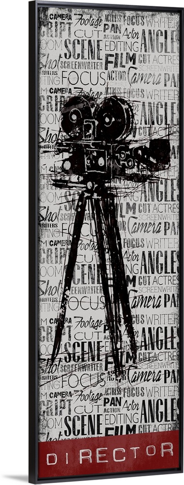 <p>A vintage camera on a background filled with layers of text, with the word "Director" at the bottom.</p>