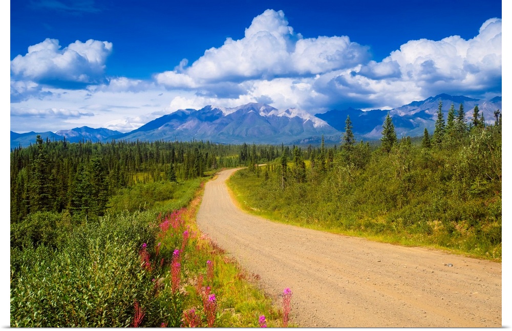 <p>Landscape photograph on a big canvas of a dirt road curving through a forest of pines and wildflowers, mountains on the horizon beneath a blue sky with large, fluffy clouds, in Alaska.</p>