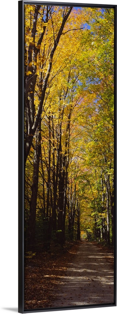 <p>Panoramic photograph shows the view down an unpaved street as the surrounding trees litter the ground with leaves.</p>