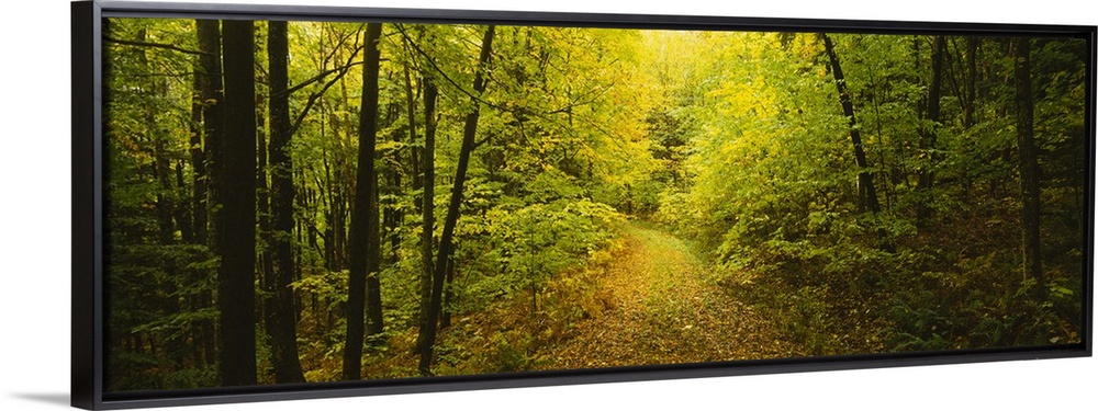 <p>This photograph is a forest scene of a path through the dense undergrowth on a panoramic canvas.</p>