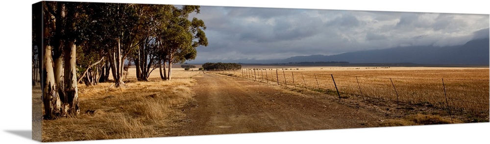 <p>Dirt road passing through field with mountain range in the background, Bartholomeus Klip Farm, Hermon, South Africa</p>