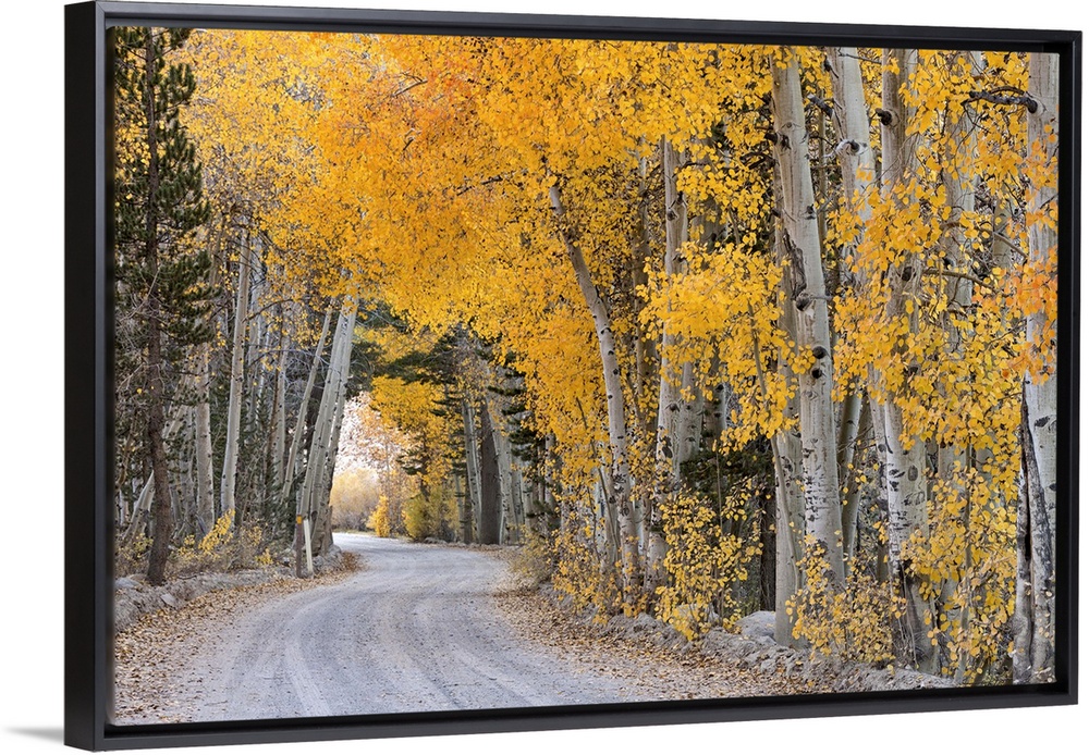 <p>Dirt road winding through a tree tunnel, Bishop, California, USA. Autumn (October)</p>