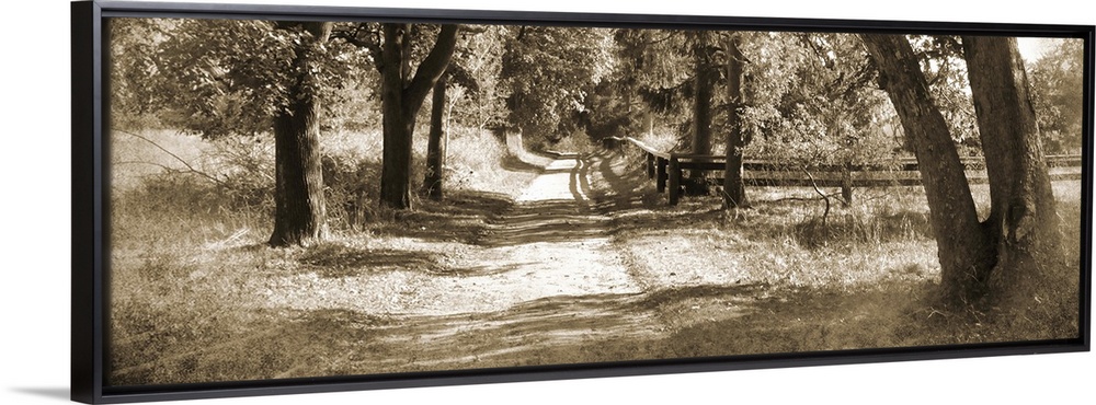 <p>Sepia toned photograph of a dirt path vanishing into a row of trees casting afternoon shadows.</p>