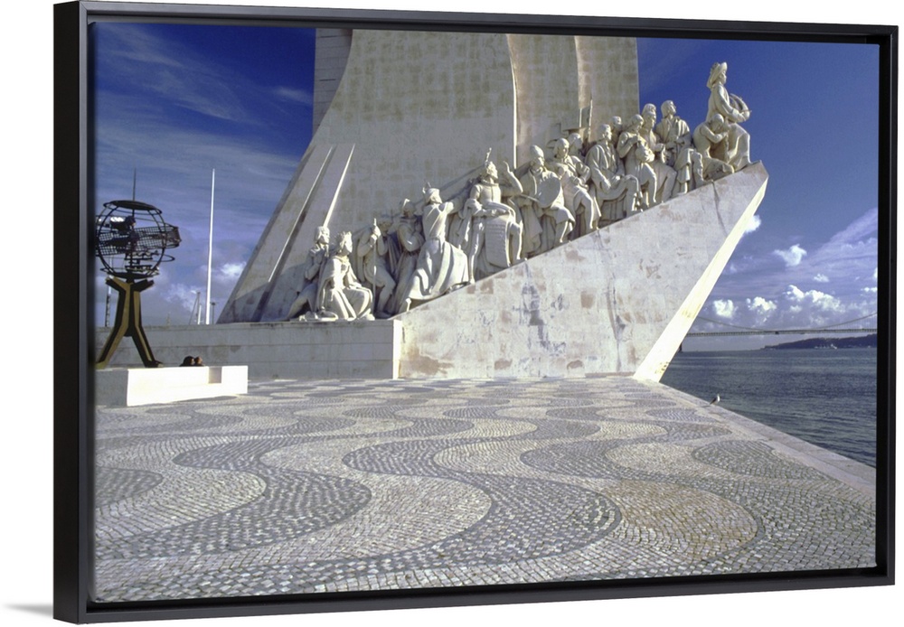 <p>Portugal, Lisbon, Belem: Monument to Discoveries features 33 figures; suspended bridge April 25 in the background; river Tagus; black and white tiles depict waves</p>