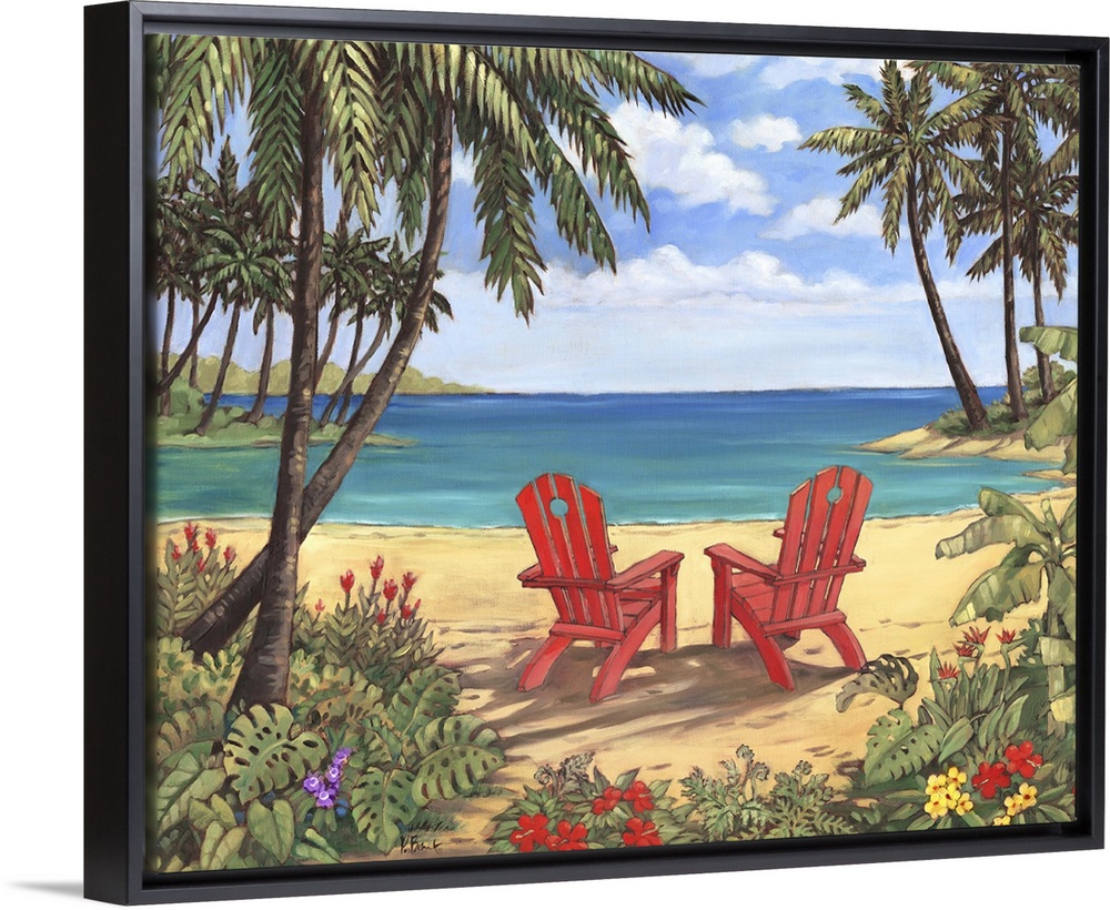 <p>Contemporary painting of two adirondack chairs on the beach, surrounded by palm trees.</p>