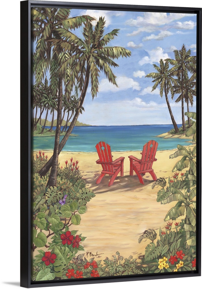 <p>Contemporary painting of two adirondack chairs on the beach, surrounded by palm trees.</p>