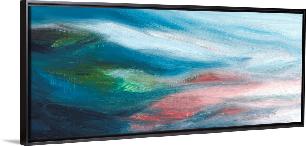 <p>Large horizontal abstract painting with movement flowing from left to right with fading colors in shades of blue, green, and pink.</p>